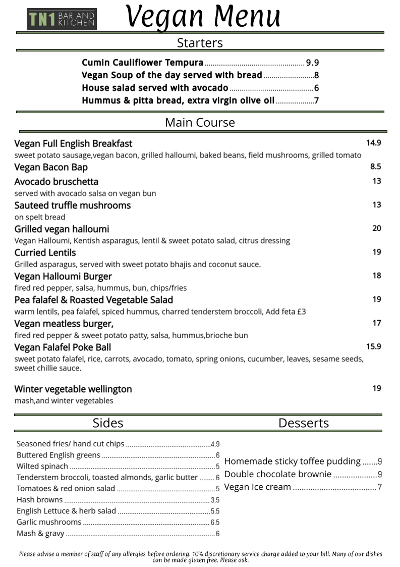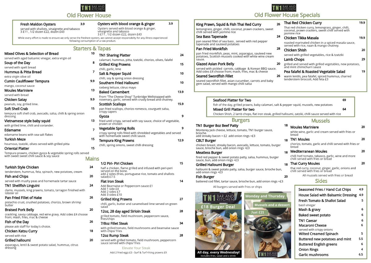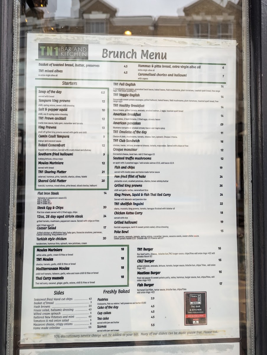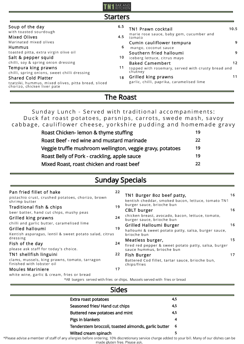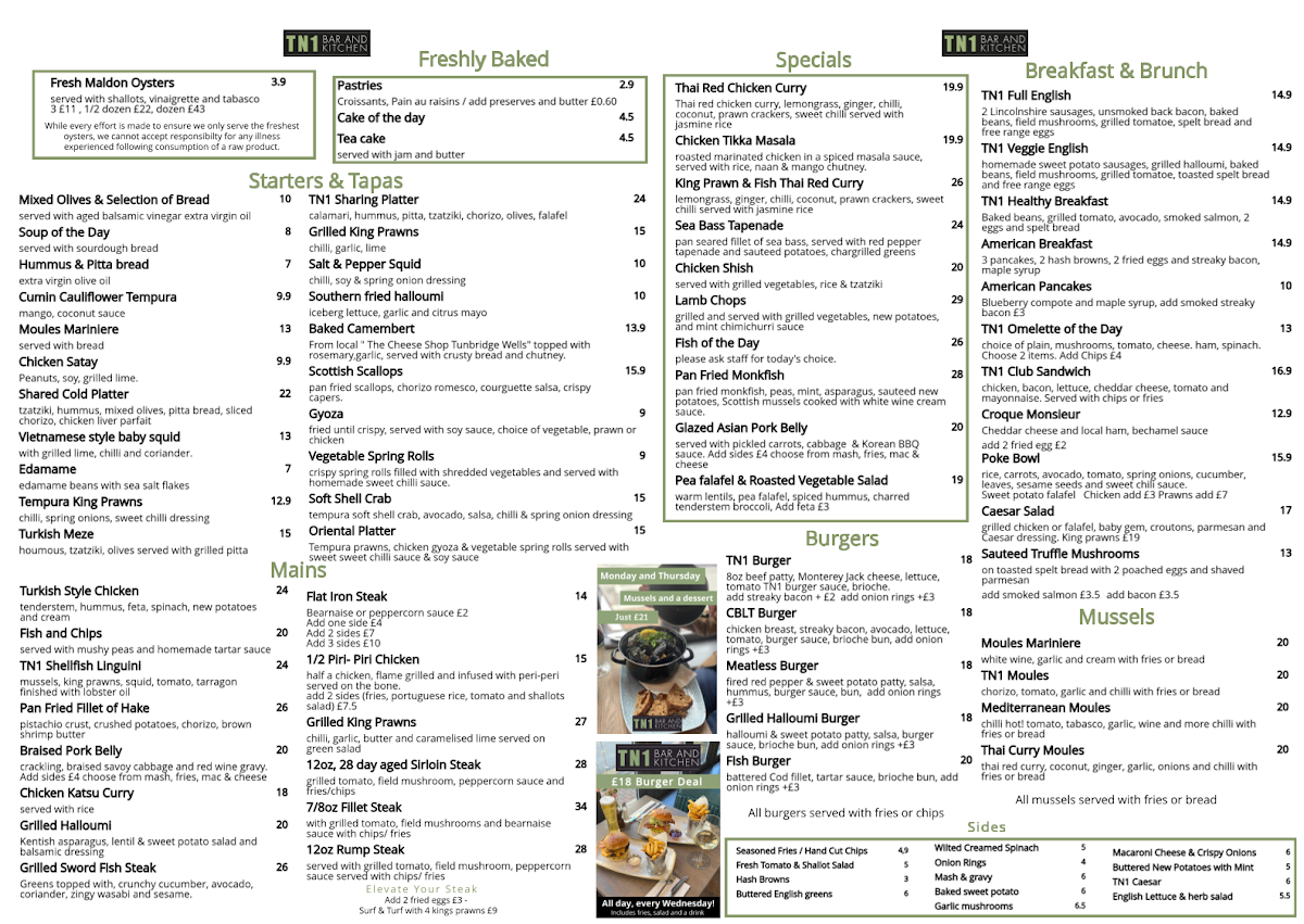 Located at 33 Monson Rd, Royal Tunbridge Wells, Tunbridge Wells TN1 1LS, United Kingdom, Tn1 Bar & Kitchen offers a delightful blend of contemporary dining and a warm, inviting atmosphere. The Tn1 Bar & Kitchen Menu features a diverse selection of dishes, perfectly suited for various tastes, making it an excellent spot for casual meals or special occasions.